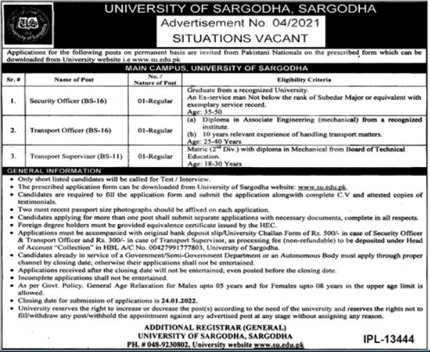 Vacancies in University of Sargodha UOS Advertisement December 2021