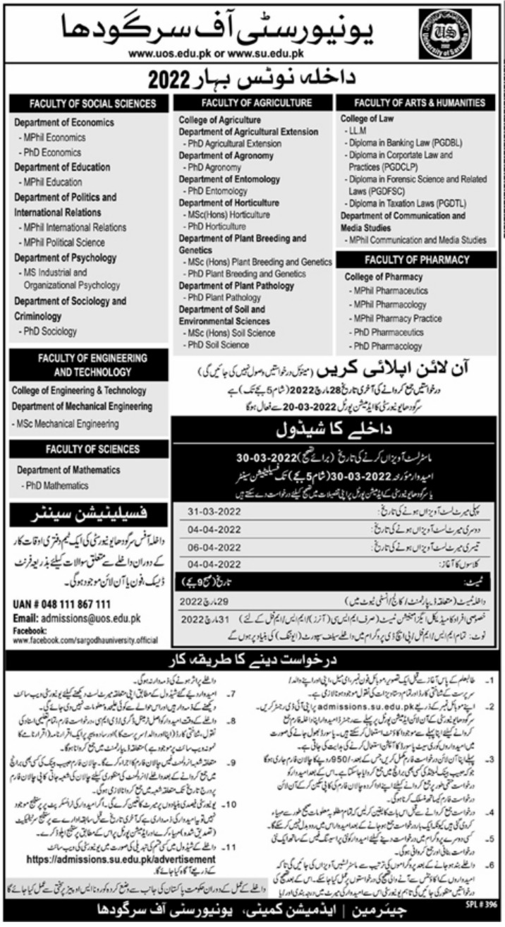 University of Sargodha UOS admissions 2022 for Mphil Economics, PhD Economics,Mphil Education, PhD Agricultural Extension, PhD Agronomy, PhD Entomology, Mphil International Relations, Mphil Political Sciences, MS Industrial & Organizational Psychology, PhD Sociology,Msc Mechanical Engineering,PhD Mathematics, Msc Hons Horticulture, PhD Horticulture, has been announced. Eligible students can apply for academic admissions 2022 in University of Sargodha UOS Sargodha Punjab Pakistan for Other University. Eligible candidates for admissions in M.sc, MS, Mphil, Master, Phd and LLM can apply as per Government institute criteria and before closing date 28 March 2022 after reading advertisement online. Read newspaper ad for exact details.