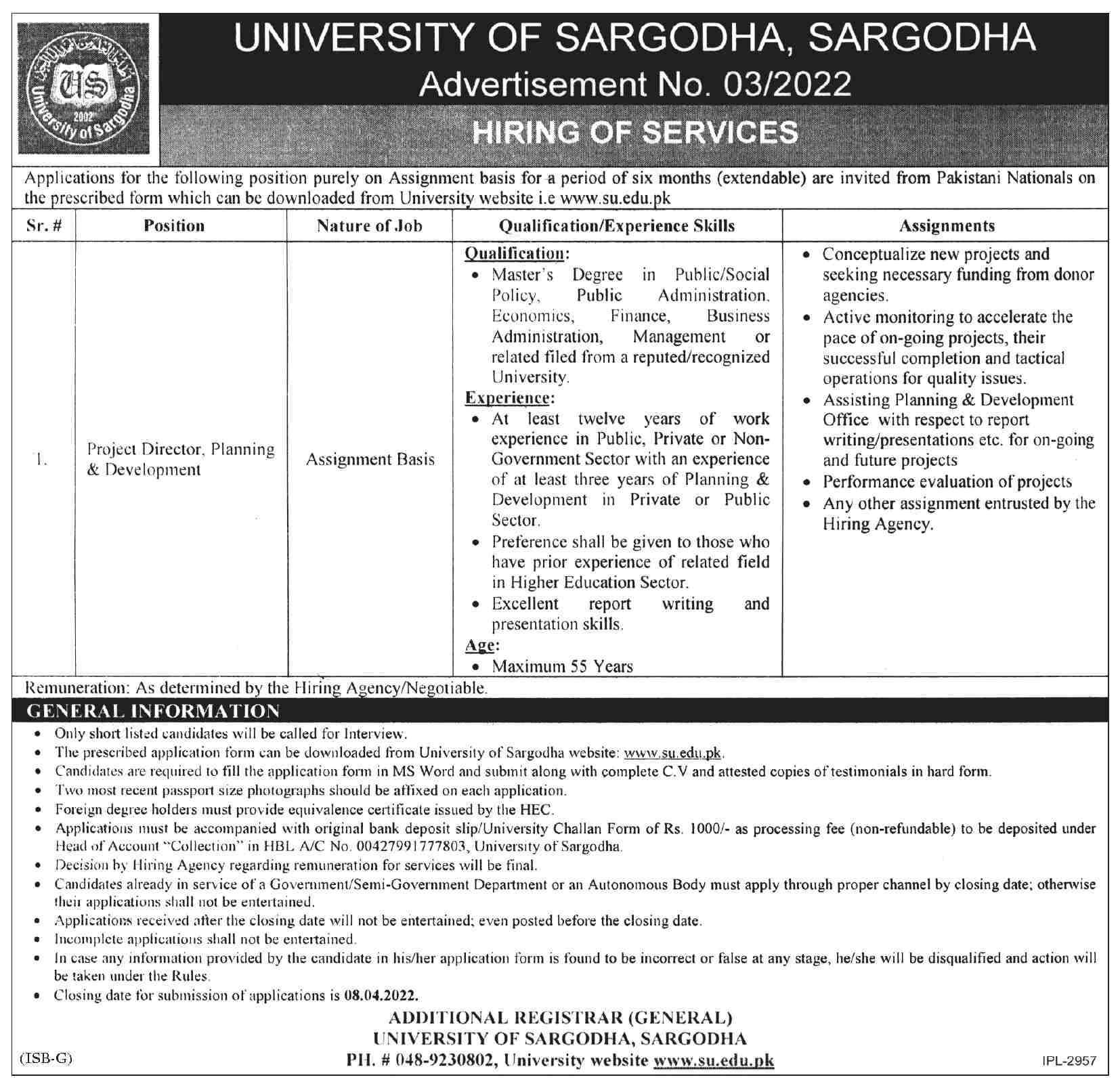 University of Sargodha UOS Sargodha, sargodha Punjab Pakistan invites applications from eligible candidates for the post of project director as per advertisement of March 19, 2022 published in daily Dawn Newspaper. Candidates with Master etc. educational background will be preferred.