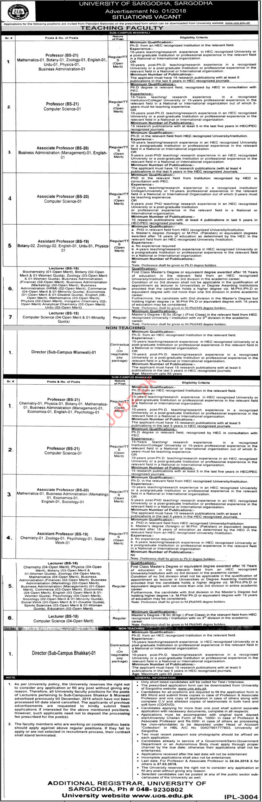 University Of Sargodha, Education Department, Government of the Punjab looks candidates for the posts of Professors, Associate Professors, Assistant Professors, Lecturers (Biochemistry, Botany, Zoology, Business Administration, Commerce, Economics, English, Mathematics, Computer Science, Physics), Director in the cities of Sargodha, Mianwali and Bhakkar.