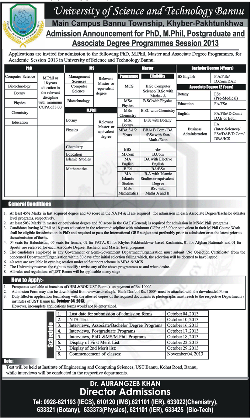 University of Science and Technology Bannu Admission in Mphill and Phd in Bannu Read newspaper ad for exact details.