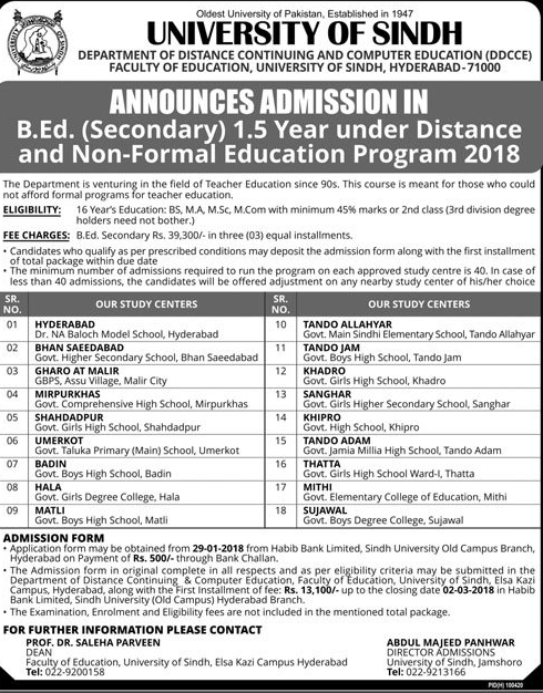 University of Sindh Admission in B.Ed Secondary 1.5 Year Under Distance and Non Formal Education Program 2018 in Hyder Abad.Admission Forms can be Obtained from 29-01-2018. Read newspaper ad for exact details.
