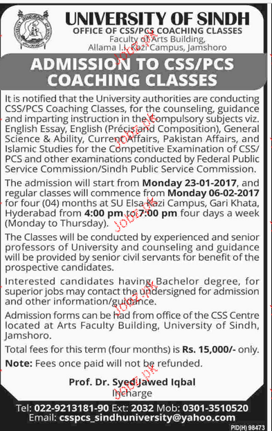 University of Sindh Admission in Courses in Jamshoro. Read newspaper ad for exact details.