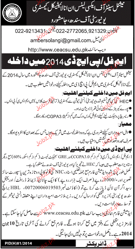 University of Sindh Admission in Mphill / Phd in Jamshoro Read newspaper ad for exact details.