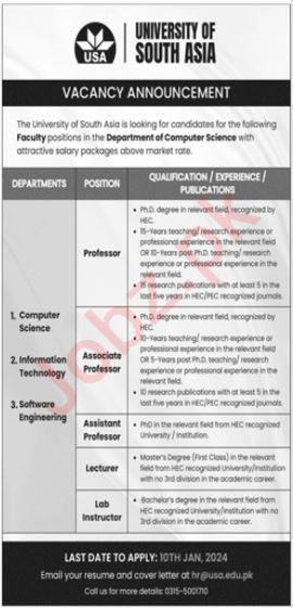 Vacant posts including assistant professor, professor, lab instructor, associate professor and lecturer are announced in University of South Asia Lahore, lahore Punjab Pakistan as per 24 December 2023 advertisement in daily Jang Newspaper. Bachelor, Phd, Master and Mphil etc. educational qualification will be preferred.
