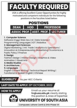 Vacancies in University of South Asia Advertisement October 2022