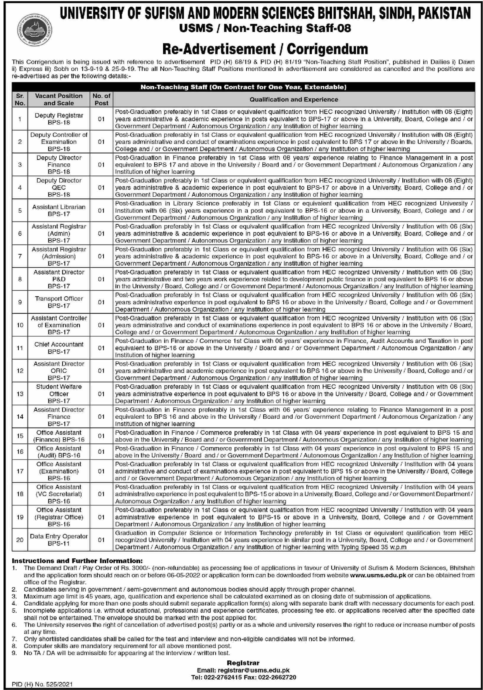 University of Sufism & Modern Sciences USMS is looking for candidates for following posts as per job advertisement published in daily Dawn Newspaper of April 9, 2022 for location Hyderabad, hyderabad Sindh Pakistan: