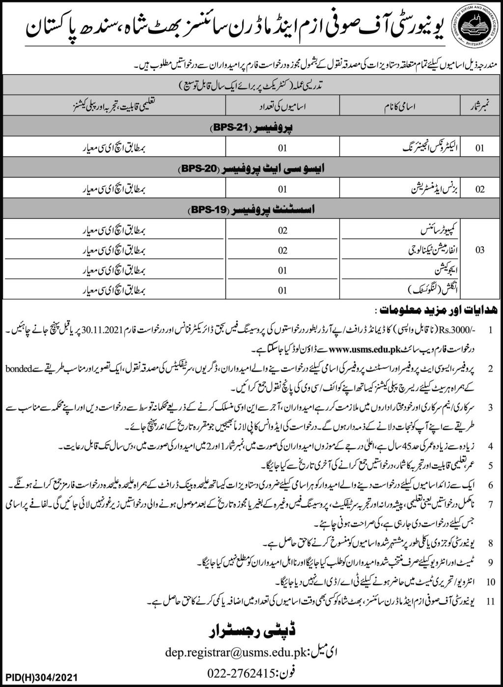 Vacancies in University of Sufism & Modern Sciences USMS Advertisement November 2021