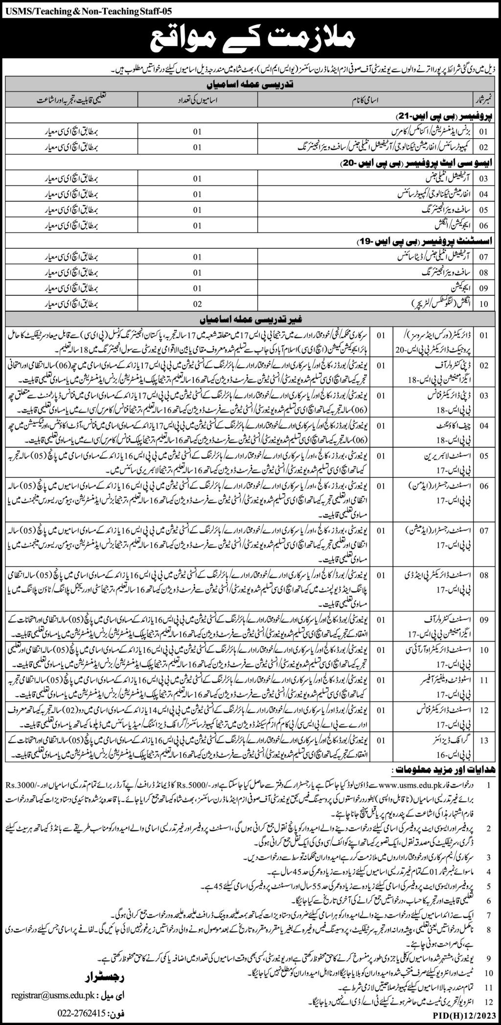 University of Sufism & Modern Sciences USMS invites applications for job positions advertised in daily Express dated 15 July 2023 for following vacancies in Hyderabad, hyderabad Sindh Pakistan.