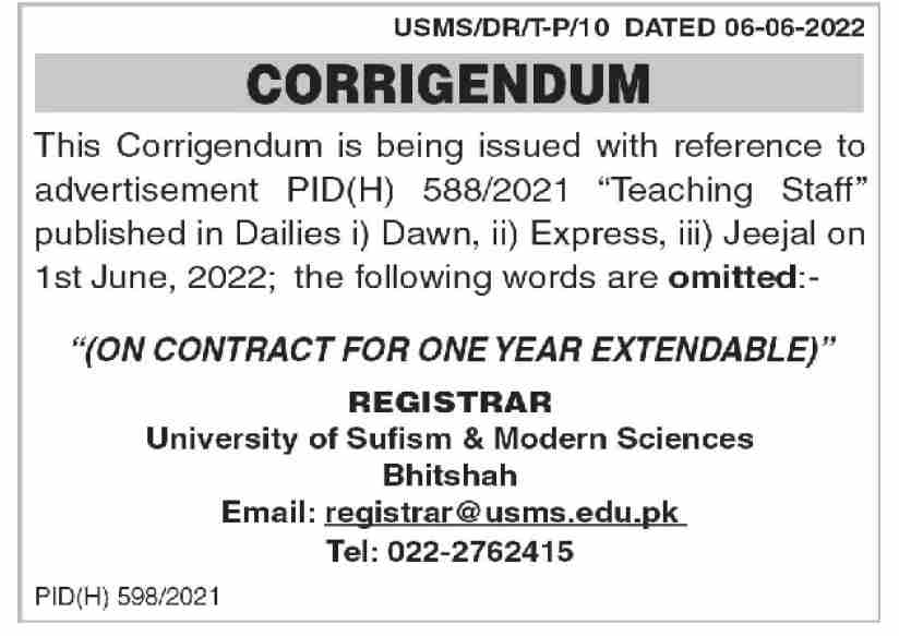 Vacancies in University of Sufism & Modern Sciences USMS Advertisement June 2022