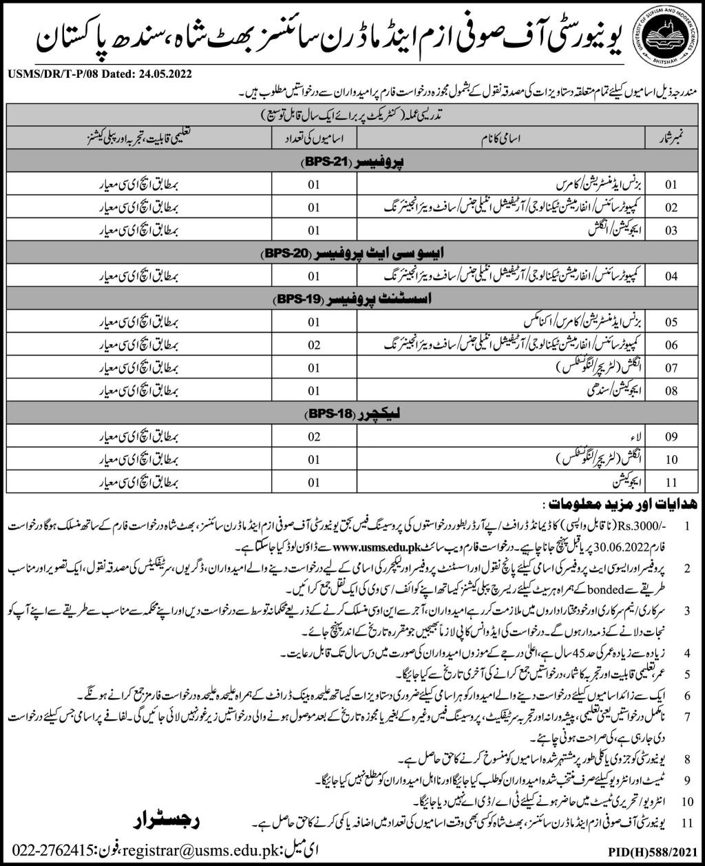 University of Sufism & Modern Sciences USMS jobs advertisement dated about 8 June 2022 in daily Dawn Newspaper invites application for the vacant post of business administration professor, assistant professor computer science, assistant professor business administration, lecturer english linguistics, professor, associate professor artificial intelligence, lecturer, assistant professor english literature, assistant professor artificial intelligence, assistant professor, assistant professor software engineering, associate professor software engineering, lecturer education, assistant professor information technology, assistant professor economics, assistant professor commerce, assistant professor english linguistics, associate professor, english professor, assistant professor sindhi, assistant professor education, education professor, associate professor computer science, lecturer english literature and commerce professor in Matiari, matiari Sindh Pakistan. Preferred Education is Mphil, Phd and Master etc.