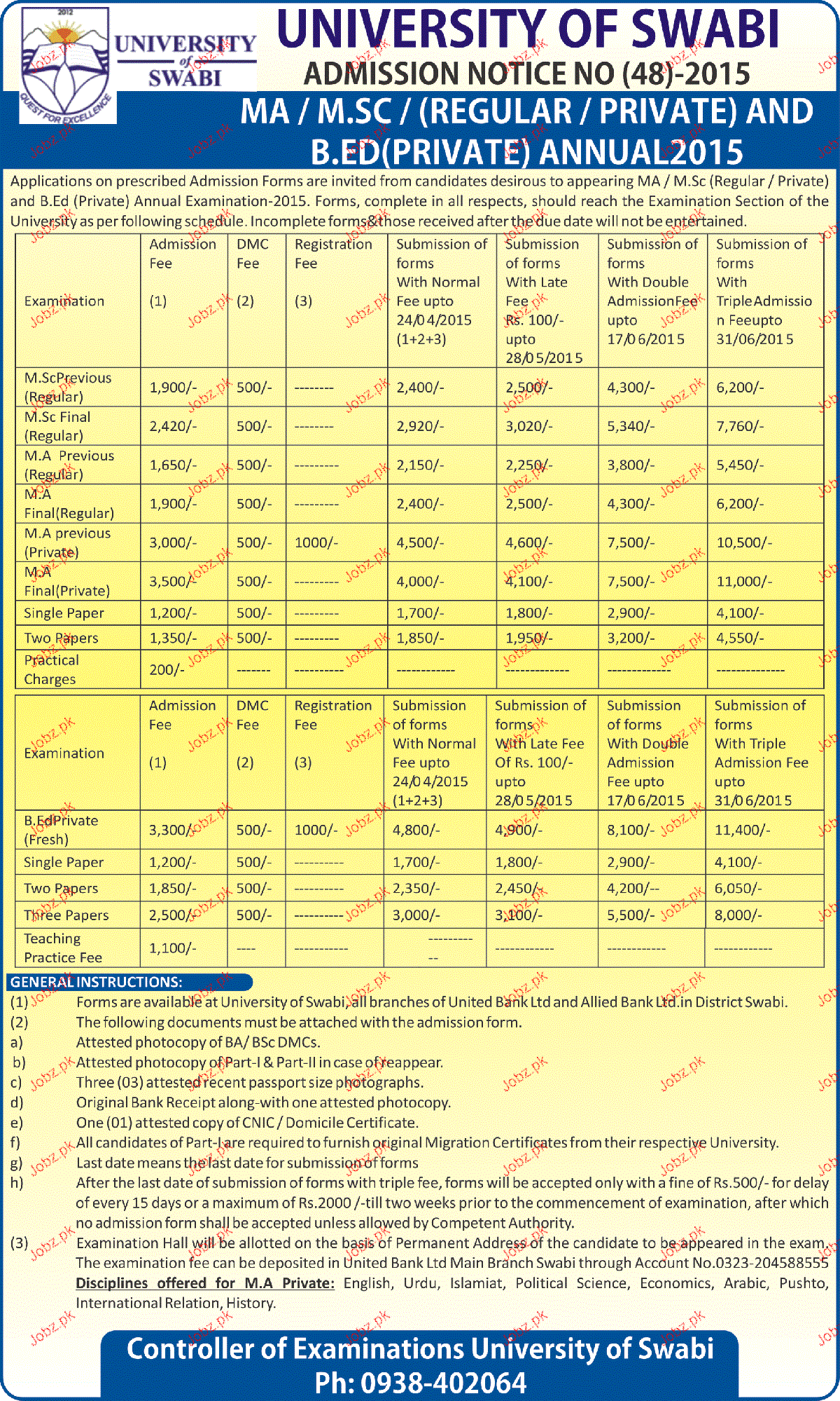 University of Swabi Admission in MA, MSc and B.Ed in Swabi. Read newspaper ad for exact details.