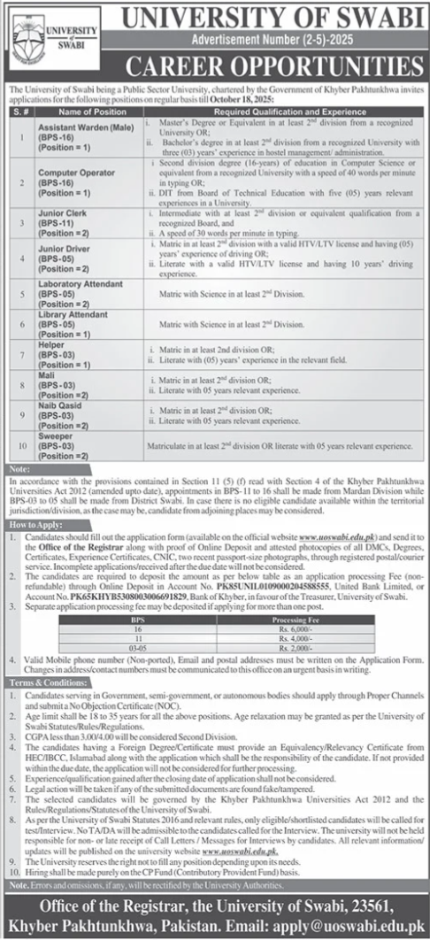 University of Swabi Swabi, swabi Khyber Pakhtunkhwa KPK Pakistan invites applications from eligible candidates for the post of library attendant, sweeper, mali, naib qasid, laboratory attendant, clerk, driver, assistant warden, helper and computer operator as per advertisement of October 3, 2025 published in daily The News Newspaper. Candidates with Master, MS, Middle, Bachelor and Matric etc. educational background will be preferred.