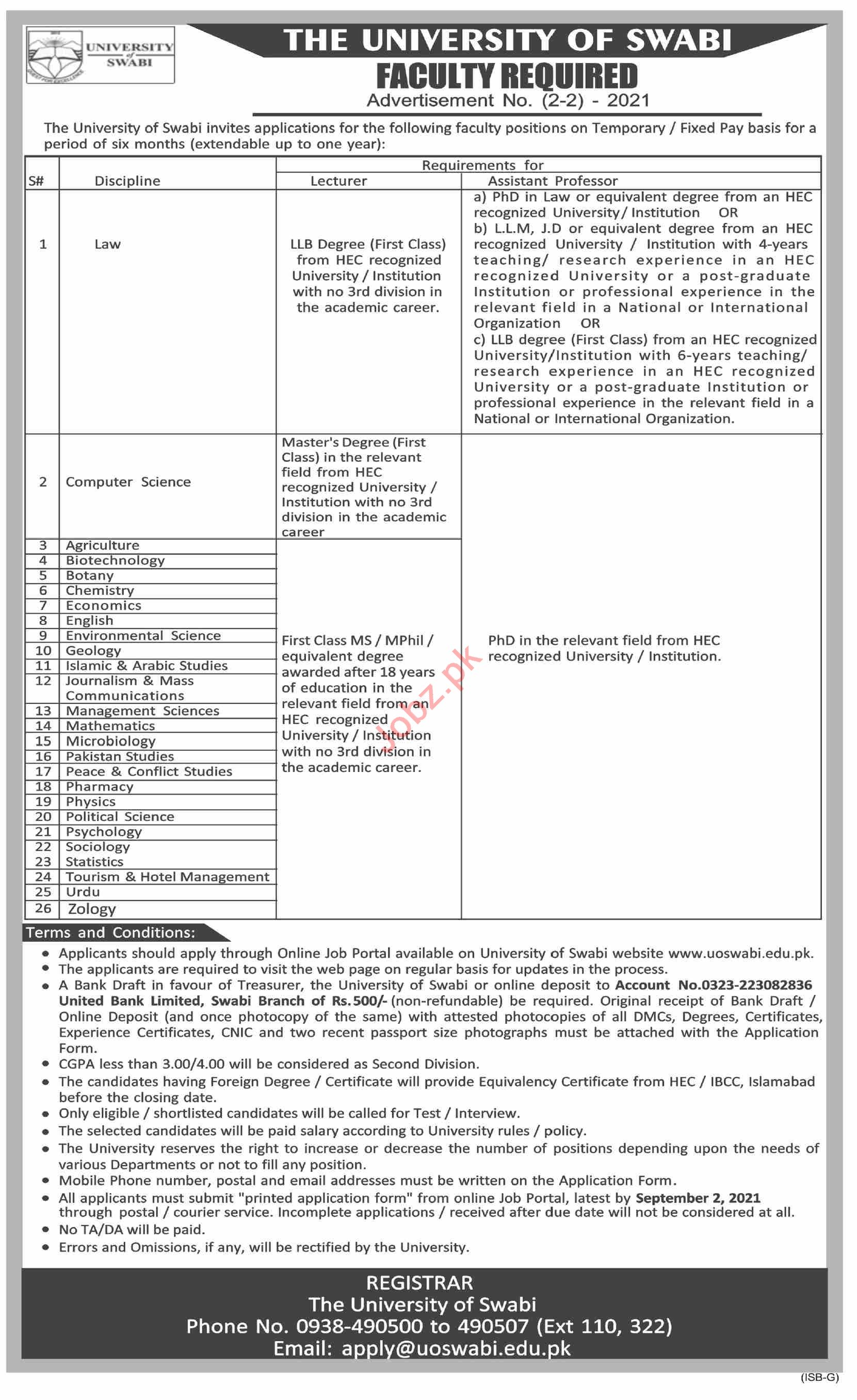 The University of Swabi UOS, Government of the KPK is seeking candidates for the posts of Lecturer, Lecturer Law, Lecturer Computer Science, Lecturer Agriculture, Lecturer Biotechnology, Lecturer Botany, Lecturer Chemistry, Lecturer Economics, Lecturer English, Lecturer Environmental Science, Lecturer Geology, Lecturer Arabic Studies, Lecturer Islamic Studies, Lecturer Journalism, Lecturer Mass Communication, Lecturer Mathematics, Lecturer Microbiology, Lecturer Conflict Studies, Lecturer Pharmacy, Lecturer Physics, Lecturer Political Science, Lecturer Psychology, Lecturer Sociology, Lecturer Statistics, Lecturer Tourism, Lecturer Hotel Management, Lecturer Urdu, Lecturer Zoology.