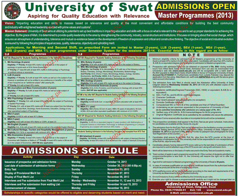University of Swat Admission in MA, LLB, MSc, B.Ed, BBS in Swat Read newspaper ad for exact details.