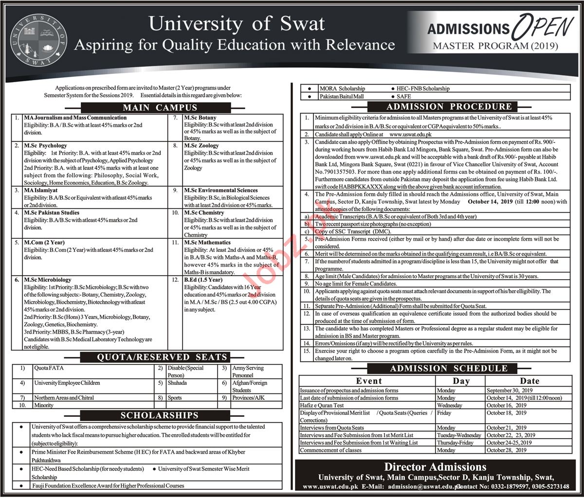 University of Swat has announced admissions in MA Journalism and Mass Communication, M.Sc Psychology, MA Islamaiyat, M.Sc Pakistan Studies, M.Com, M.Sc Microbiology, M.Sc Botany, M.Sc Zoology, M.Sc Environmental Sciences, M.Sc Chemistry, M.Sc Mathematics, B.Ed in Swat. Read newspaper ad for exact details.