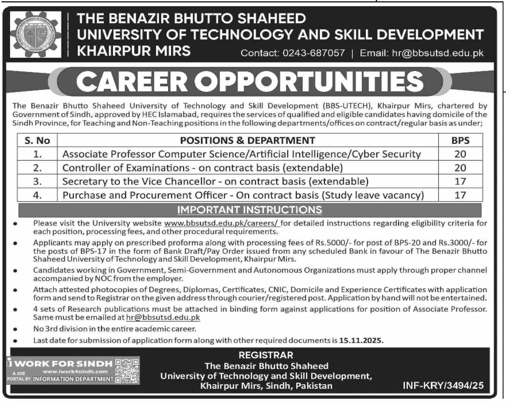 Apply at Benazir Bhutto Shaheed University of Technology & Skill Development latest Government jobs in Management and departments before closing date which is around November 15, 2025 or as per closing date in newspaper ad. Read complete ad online to know how to apply on latest Benazir Bhutto Shaheed University of Technology & Skill Development job opportunities.