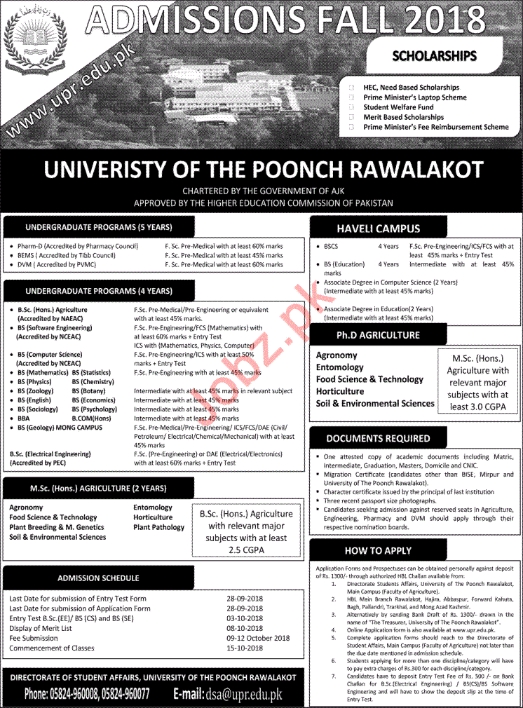 University of The Poonch Rawalakot Azad Jammu & Kashmir AJK offered admissions for Masters, MSc Hons, Pharm-D, Engineering, BE, DVM, undergraduate & PhD Programs 2018. Read newspaper ad for exact details.
