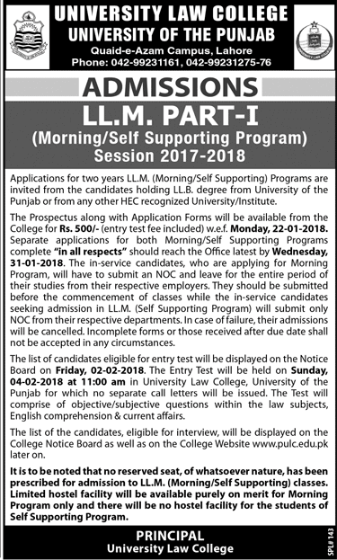 University Law College University of the Punjab Admission in LLM in Lahore. Morning / Self Supporting Program session 2017-208. List will be displayed on 02-02-2018. Read newspaper ad for exact details.