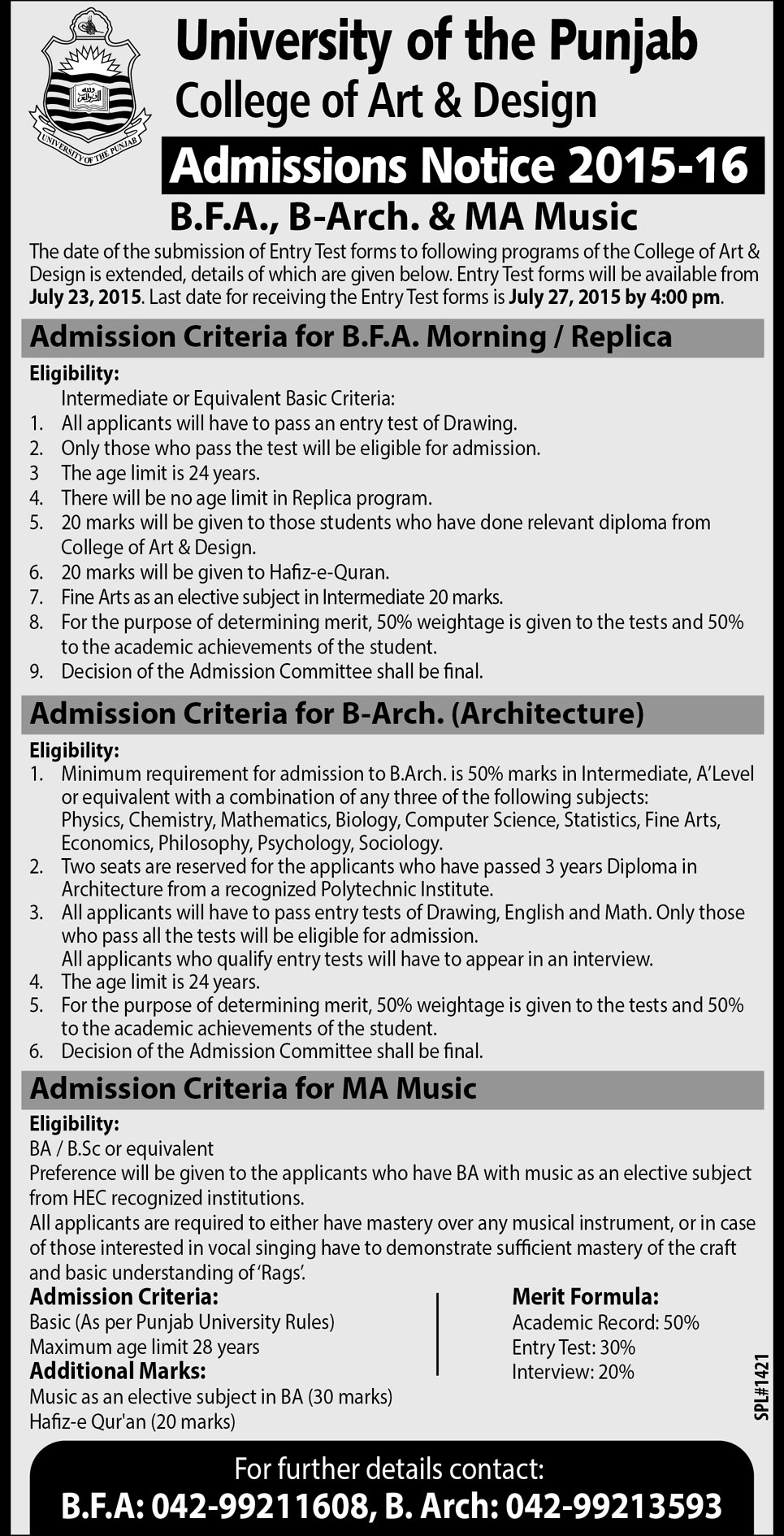 University of the Punjab Admission in BFA, BA and MA in Lahore. Read newspaper ad for exact details.