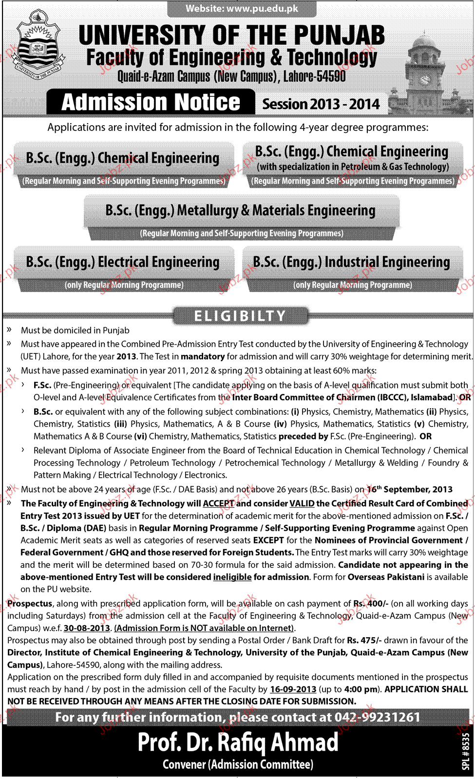 University of the Punjab Admission in BSc Engineering in Lahore Read newspaper ad for exact details.