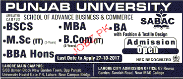 University of the Punjab School of Advance business & Commerce Admission in BSCS, MBA, BA With Fasion & Textile Design MSC IT, B.Com and BBA Hons in Lahore. Read newspaper ad for exact details.