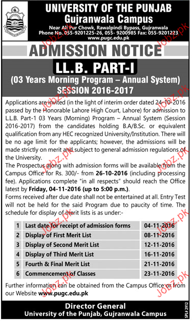 University of the Punjab Admission in LLB in Gujranwala. Read newspaper ad for exact details.