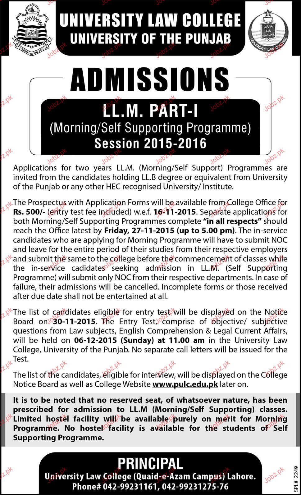 University of the Punjab Admission in LLM in Lahore. Read newspaper ad for exact details.