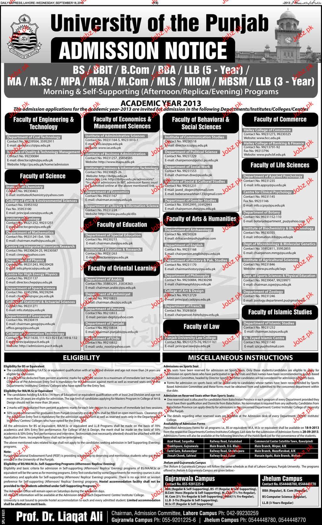 University of the Punjab Admission in MA, Msc, MPA, MCom, MLS, LLB and MBSM in Lahore Read newspaper ad for exact details.