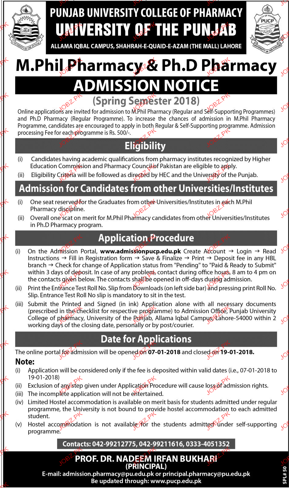 University of the Punjab Admission in Mphill Pharmacy and Phd Pharmacy in Lahore. The online portal for admission willbe opened on 07-01-2018 and closed on 19-01-2018. Read newspaper ad for exact details.