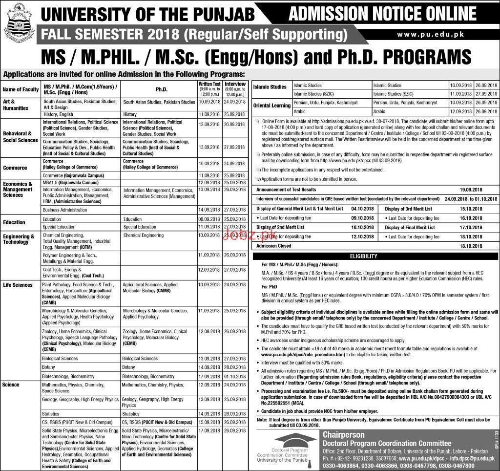 University of the Punjab Admission in MS / M.Phill / MSc Engineering Hons and Phd Programs Admission in Lahore. Fall Semester 2018. Admission Open for Both Male / Female Students. Read newspaper ad for exact details.