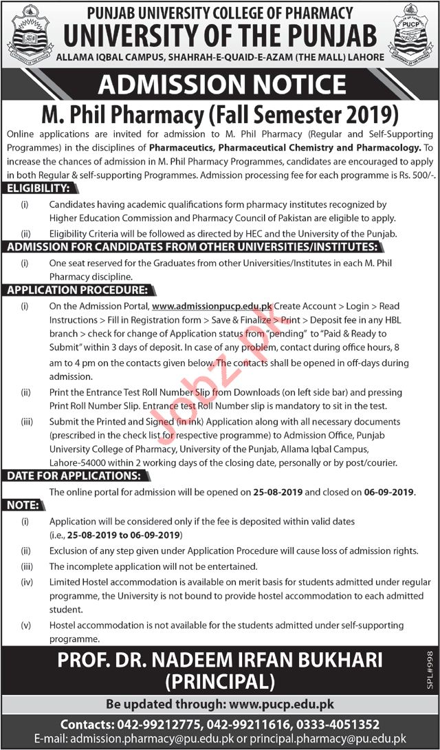 Punjab University College of Pharmacy are invited for admissions in M.Phil Pharmacy Regular and Self Supporting in the disciplines of Pharmaceutics, Pharmaceutical Chemistry, Pharmacology in Punjab University College of Pharmacy Lahore. Read newspaper ad for exact details.