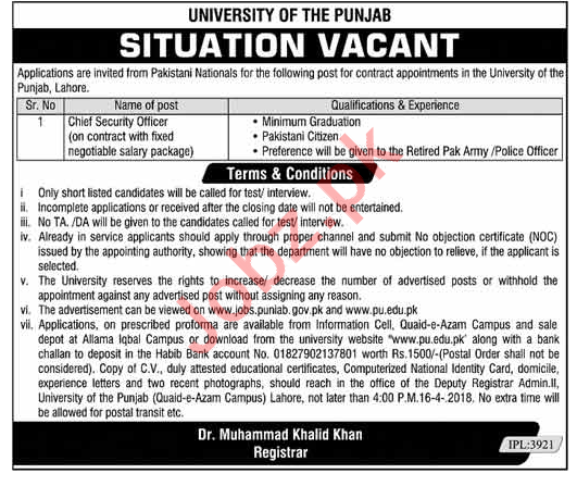 University of the Punjab Jobs 2018 Chief Security Supervisor
