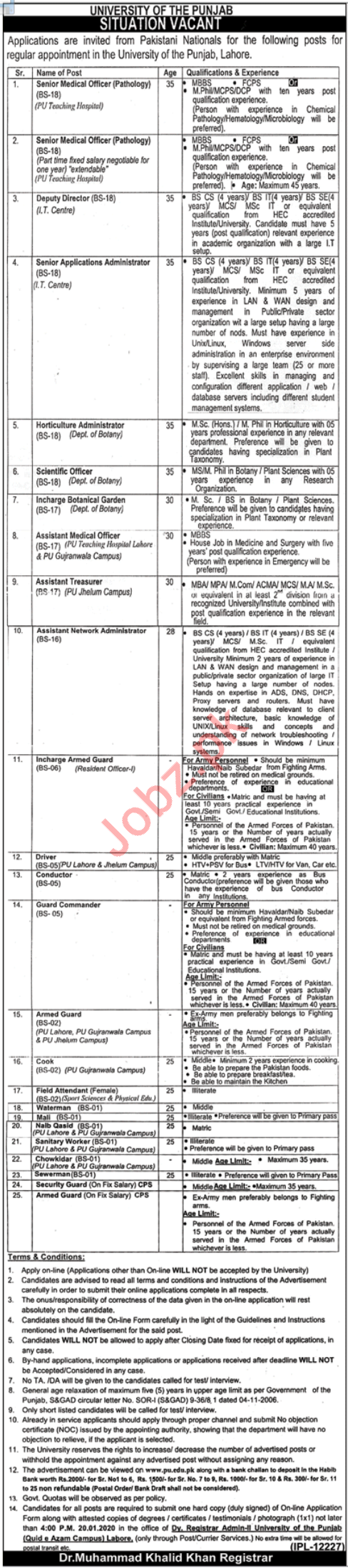 University of The Punjab invites applications from medical, health, mbbs, doctors and experienced individuals for the positions of Medical Officer Pathology, Deputy Director, Applications Administrator, Horticulture Administrator, Scientific Officer, Incharge Botanical Garden, Assistant Medical Officer, Assistant Treasurer, Assistant Network Administrator, Incharge Armed Guard, HTV Driver, PSV Driver, LTV Driver, Conductor, Guard Commander, Armed Guard, Cook, Field Assistant, Water Man, Mali, Naib Qasid, Sanitary Worker, Chowkidar, Sewer Man and Security Guard in Lahore, Gujranwala & Jhelum Campuses.