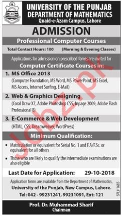 University of the Punjab PU Lahore, Pakistan are opened admissions 2018 for the classes of MS Office 2013, Web & Graphic Designing, E Commerce and Web Development. Read newspaper ad for exact details.