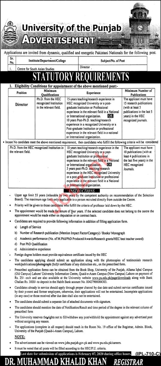 Vacancies in University Of The Punjab PU Advertisement January 2020