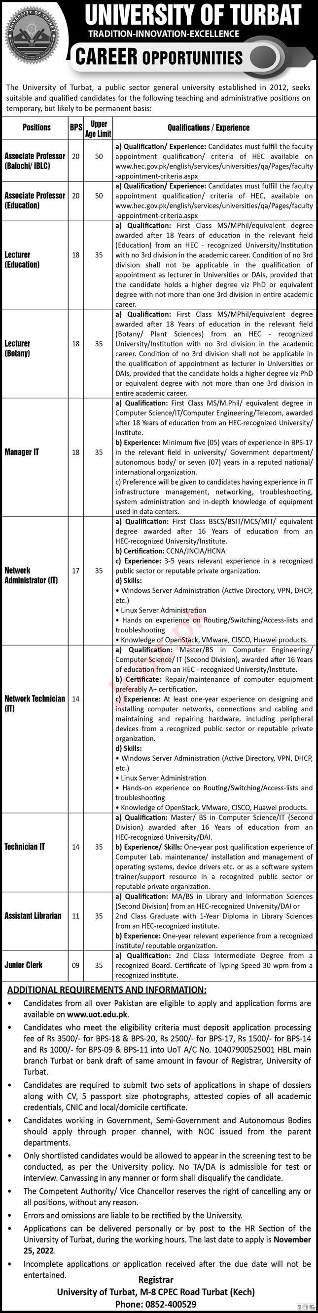 University of Turbat is looking for candidates for following posts as per job advertisement published in daily Express Newspaper of October 30, 2022 for location Turbat, turbat Balochistan Pakistan: