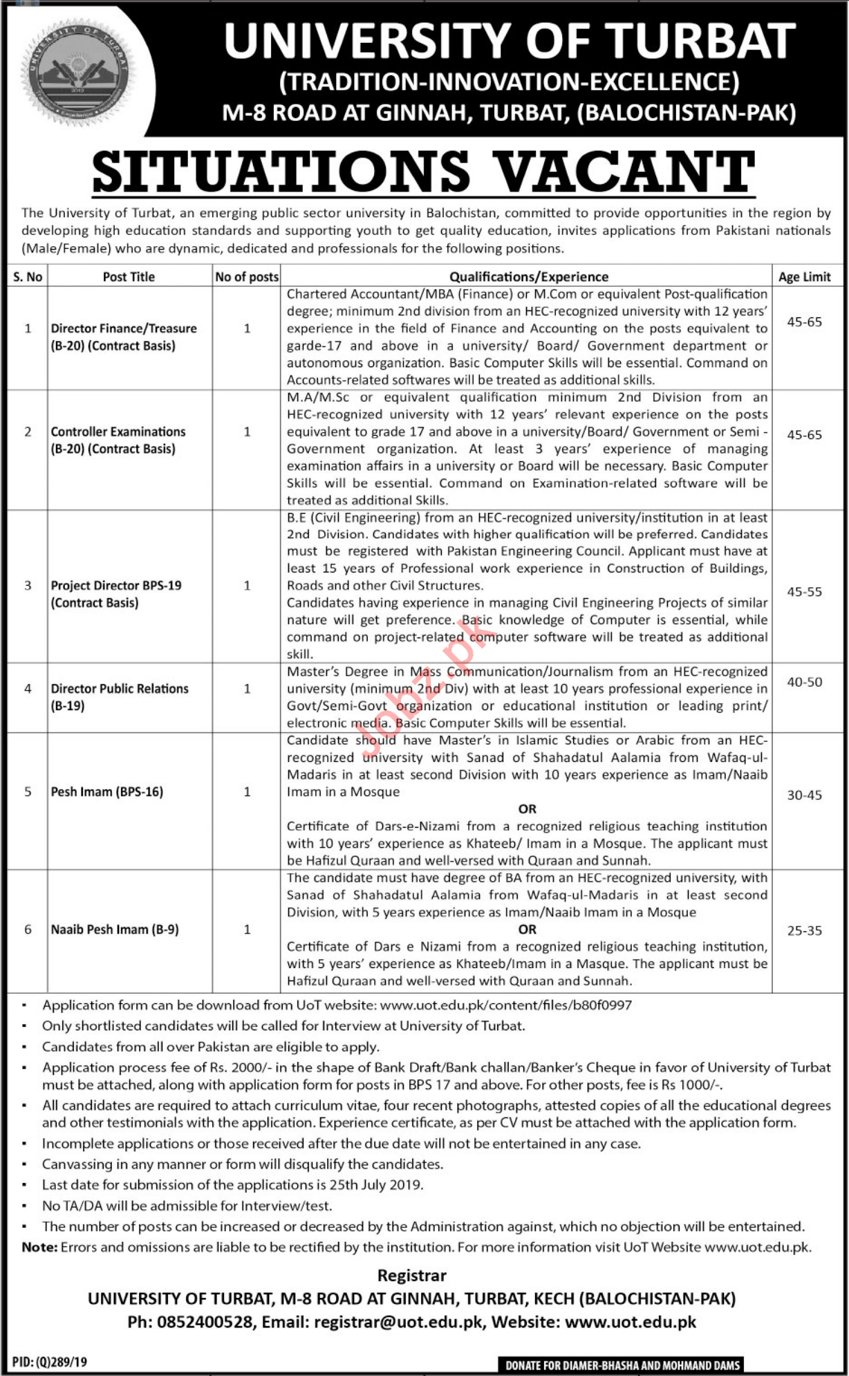 A Well-Known Government Organization University Of Turbat in Turbat is looking for qualified, expert and Well-Mannered staff for their Organization for the Job of Director Finance/Treasurer, Controller Examinations, Project Director, Director Public Relations, Pesh Imam and Naib Pesh Imam.