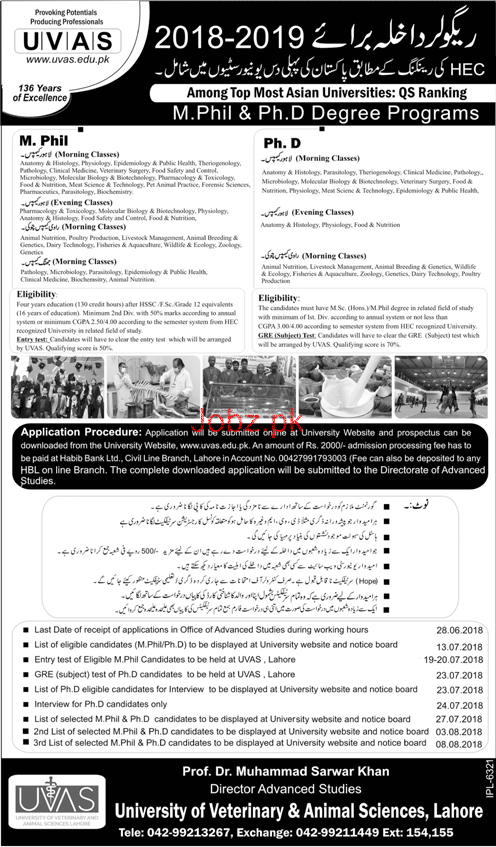University of Veterinary and Animal Sciences UVAS Admission in Mphill and Phd in Lahore. Admission Open for Morning and evening classes in Jhang, Ravi and Lahore Campuses. Read newspaper ad for exact details.