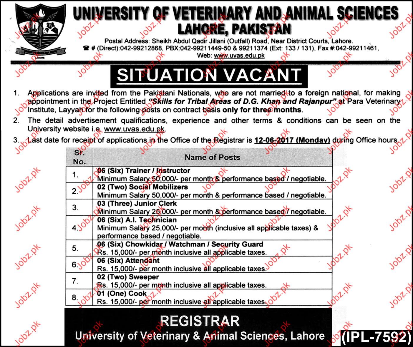 University of Veterinary and Animal Sciences UVAS career Opportunities for Trainer, Instructor, Social Mobilizers, Junior Clerks, AI Technicians, Chowkidaar, Watchman, Security Guard, Attendant, Sweeper and Cook in Lahore. Get more detail from this website uvas.edu.pk