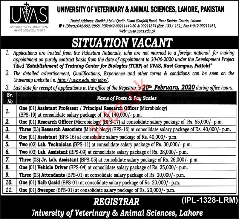 Vacancies in University of Veterinary and Animal Sciences UVAS Advertisement February 2020