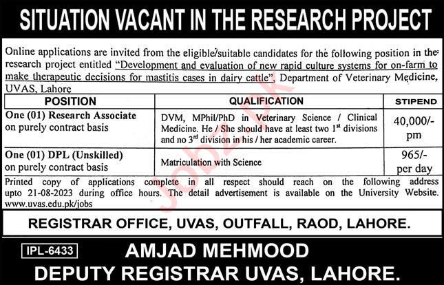 University of Veterinary and Animal Sciences UVAS invites applications for job positions advertised in daily Express dated 13 August 2023 for following vacancies in Lahore, lahore Punjab Pakistan.