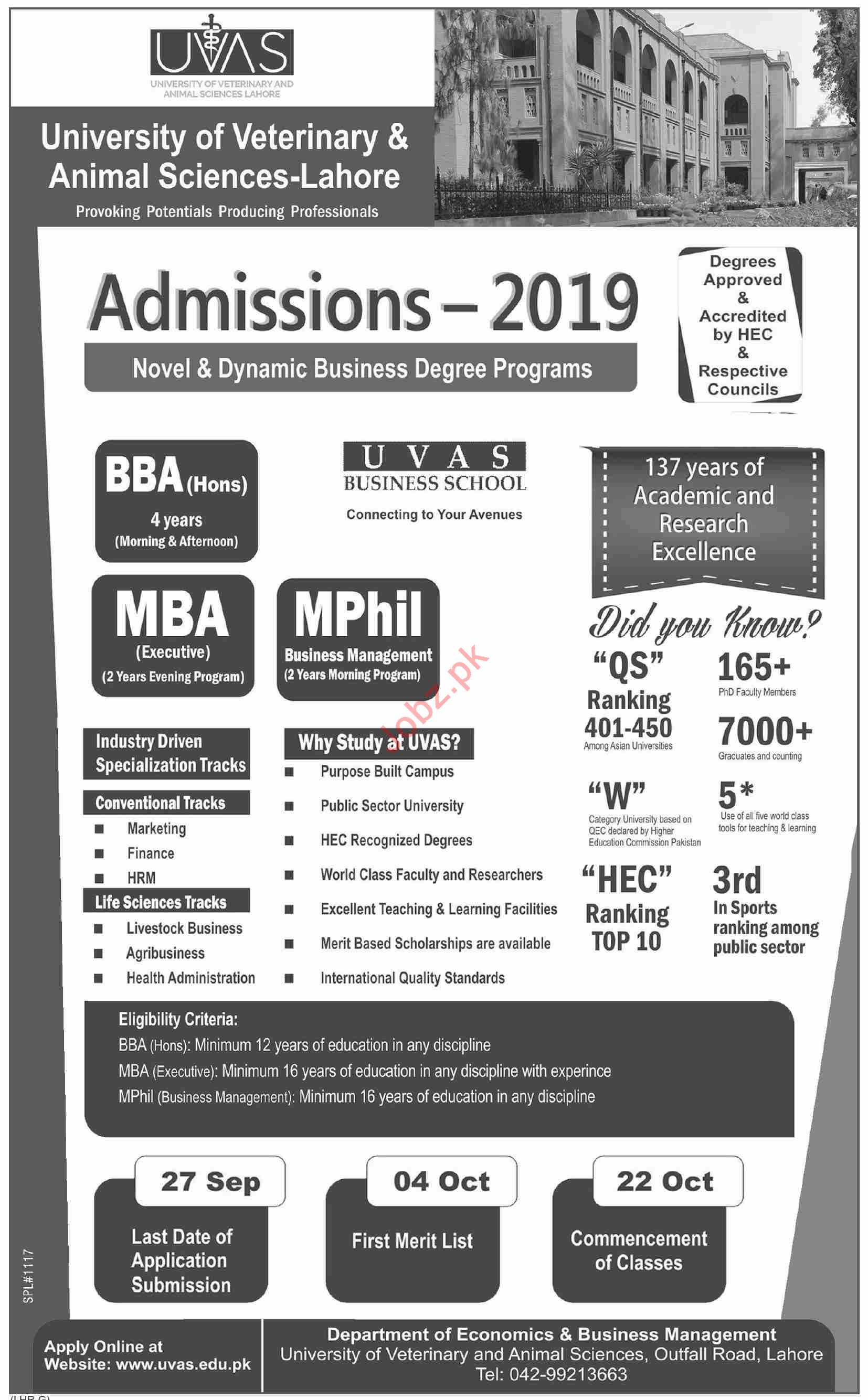 University of veterinary and Animal Sciences UVAS Lahore is offering Admissions Novel and Dynamics Business Degree Program in BBA, MBA, M.Phil Management Sciences in Lahore. Read newspaper ad for exact details.