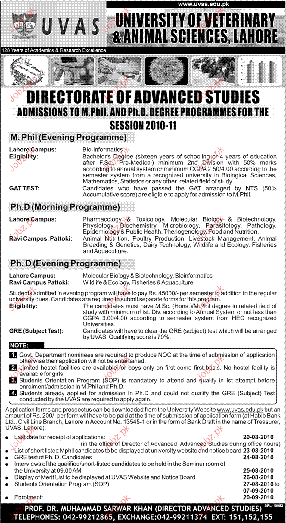 M.Phil, Ph.D Admission Open in University of Veterinary & Animal Sciences Lahore Read newspaper ad for exact details.