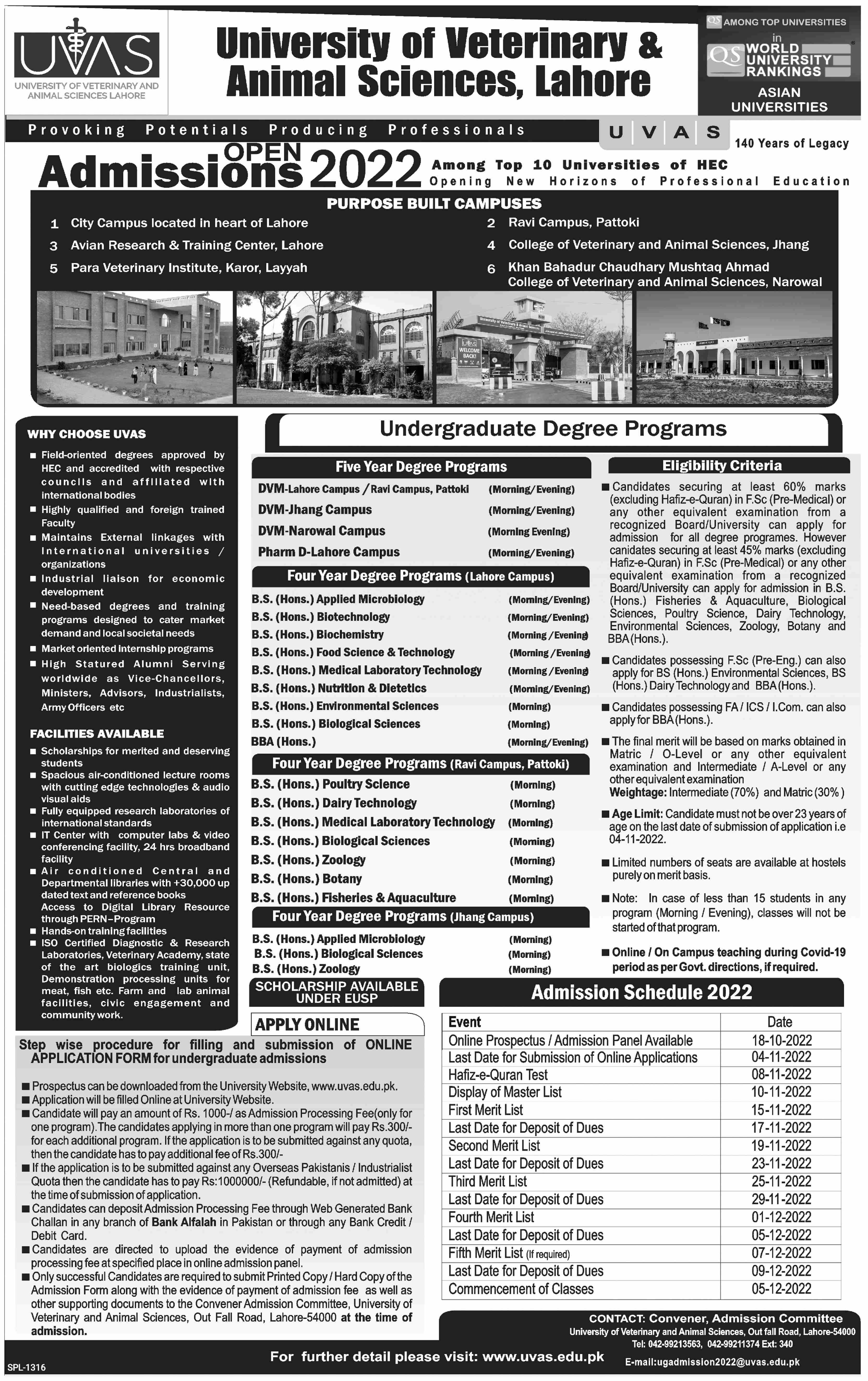 University of Veterinary and Animal Sciences Doctor of Veterinary Medicine DVM, Pharm D, BS in Applied Microbiology, Biotechnology, Biochemistry, Food Science & Technology, Medical Laboratory Technology, Nutrition & Dietetics, Environmental Science, Biological Science, BBA, BS Hons in Poultry Science, Dairy Technology, Medical Laboratory Technology, Zoology, Fisheries & Aquaculture, Applied Microbiology, Biological Science, admissions 2022 has been started. Eligible students who qualify as per admission criteria in University of Veterinary and Animal Sciences Lahore Punjab Pakistan can apply in Science University for academic year 2022. Students for admissions in BS, Pharm D, BBA, DVM and BS Hons can apply for online or campus classes as per Government institute criteria till admission closing date November 4, 2022. Read newspaper ad for exact details.