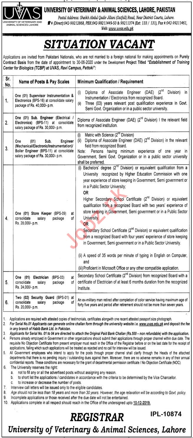 University of Veterinary & Animal Sciences UVAS is seeking applications from highly qualified and technical candidates for the posts of Instrumentation Supervisor, Electronics Supervisor, Electrical Sub Engineer, Electronics Sub Engineer, Mechanical Sub Engineer, Storekeeper, Electrician and Security Guard in Lahore.