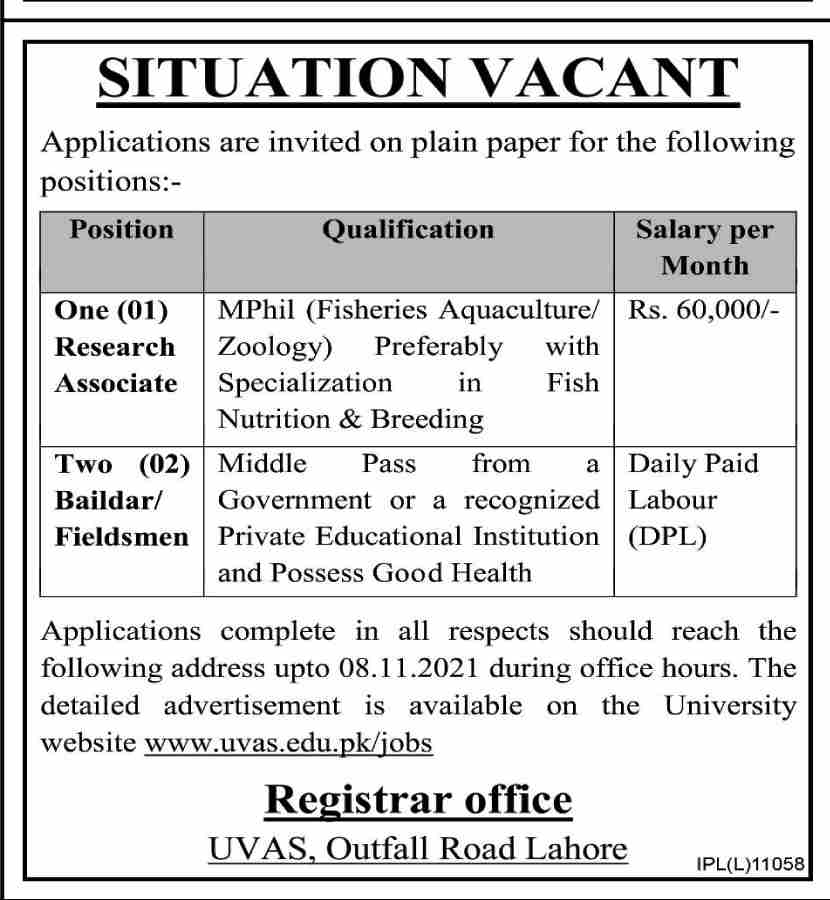 Vacancies in University of Veterinary and Animal Sciences UVAS Advertisement November 2021
