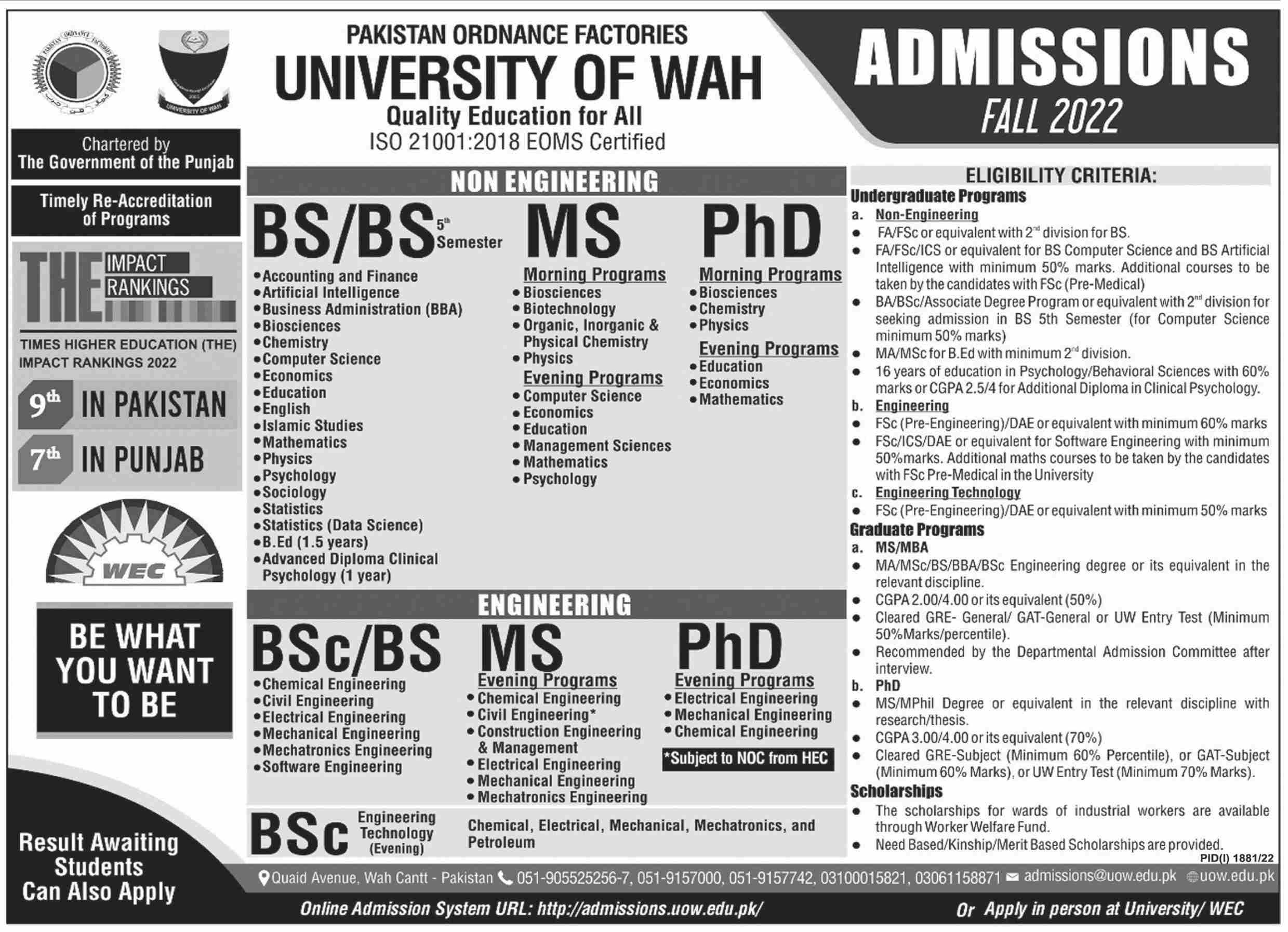 University of Wah BS in Accounting and Finance, Artificial Intelligence, Business Administration BBA, Biosciences, Chemistry, Computer Science. MS in Biosciences, Organic Inorganic, Economics, Education, Psychology. PhD in Chemistry, Physics, Economics, Mathematics. admissions 2022 has been started. Students who want to take admissions in University of Wah Wah Cantt Punjab Pakistan for academic year 2022 to continue education in Teaching University can apply. Students for admissions in BS, Phd, Master, Bachelor and MS can apply for online or campus classes as per Government institute criteria till admission closing date October 31, 2022. Read newspaper ad for exact details.