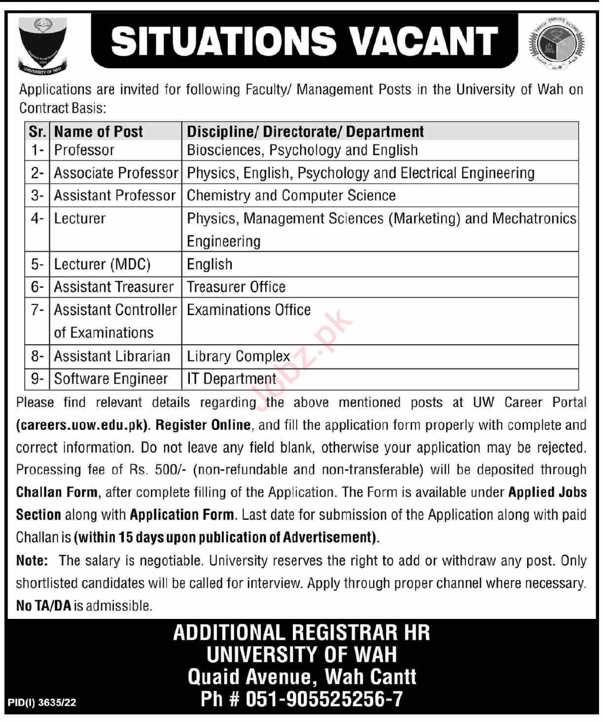 University of Wah invites applications for job positions advertised in daily Dawn dated 12 December 2022 for following vacancies in Wah Cantt Punjab Pakistan.