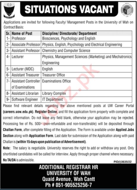 University of Wah jobs advertisement dated about 11 December 2022 in daily Jang Newspaper invites application for the vacant post of lecturer, assistant librarian, assistant controller of examination, associate professor, professor, software engineer, assistant professor and assistant trasurer in Wah Cantt, wah cantt Punjab Pakistan. Persons with MCS, MIT, Phd, Mphil, Master, MS and Bachelor etc. education can apply.